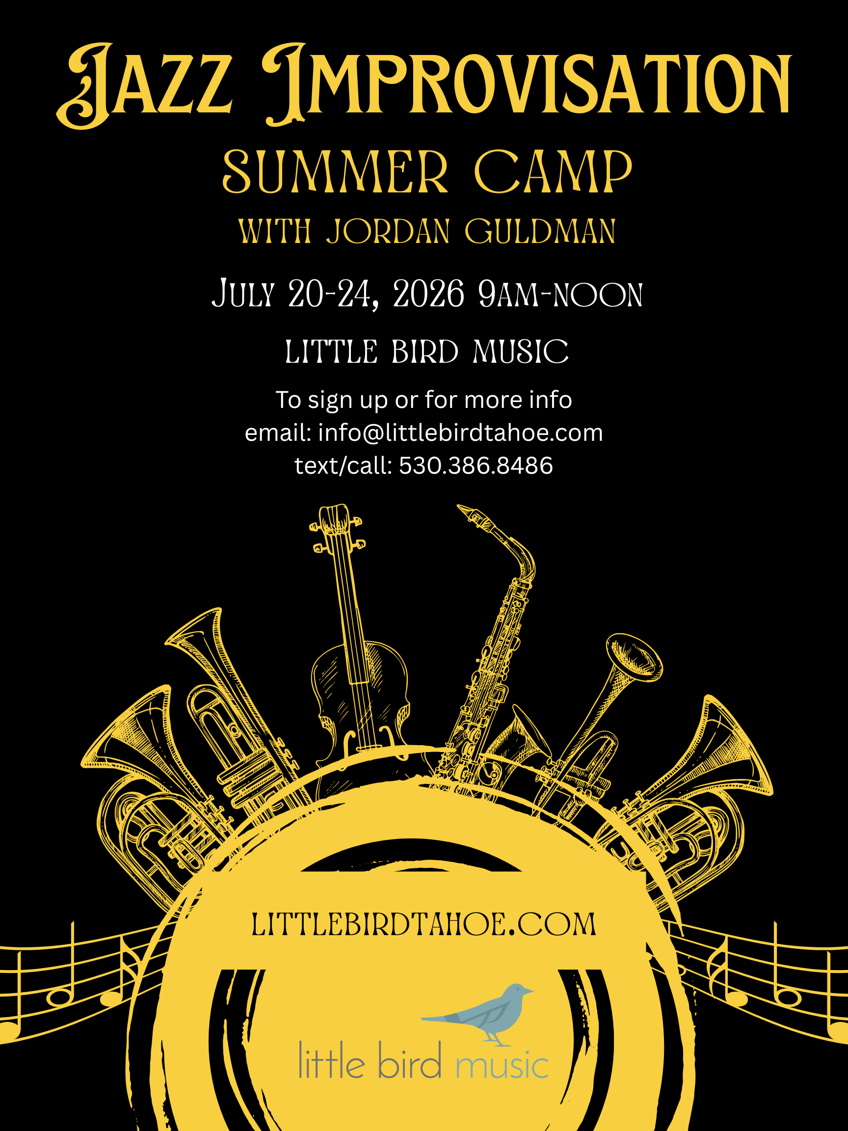 This Jazz Improvisation Summer Camp, led by Jordan Guldman (a Truckee native, ACMS, Truckee High, and Little Bird Music alum, Oberlin Conservatory grad, and master's degree student at the Manhattan School of Music), covers a history of jazz from its West African roots to New Orleans and modern day jazz, providing students with hands-on opportunities to learn the art of improvisation, soloing, and the freedom and joy of playing jazz. Students will learn how to navigate common blues and bebop chord progressions and build a list of essential tunes to practice and play on their own. The camp is ideal for students in the local school band programs, as well as for students of any instrument interested in exploring jazz and improvisation.